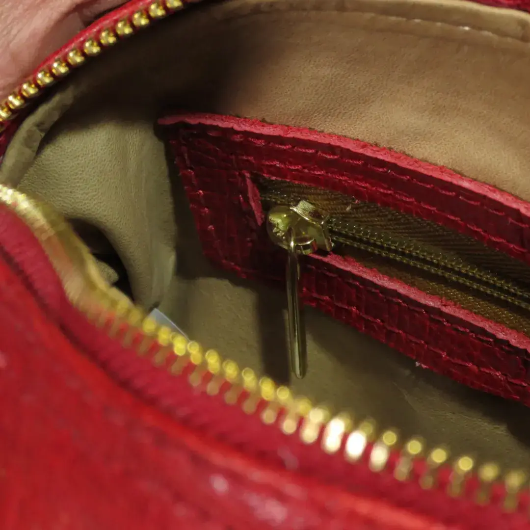 Baúl 100 % cuero, manijas tejidas a mano y cargador largo removible. Herrajes y cremallera dorado. Con deslizadores en la base.