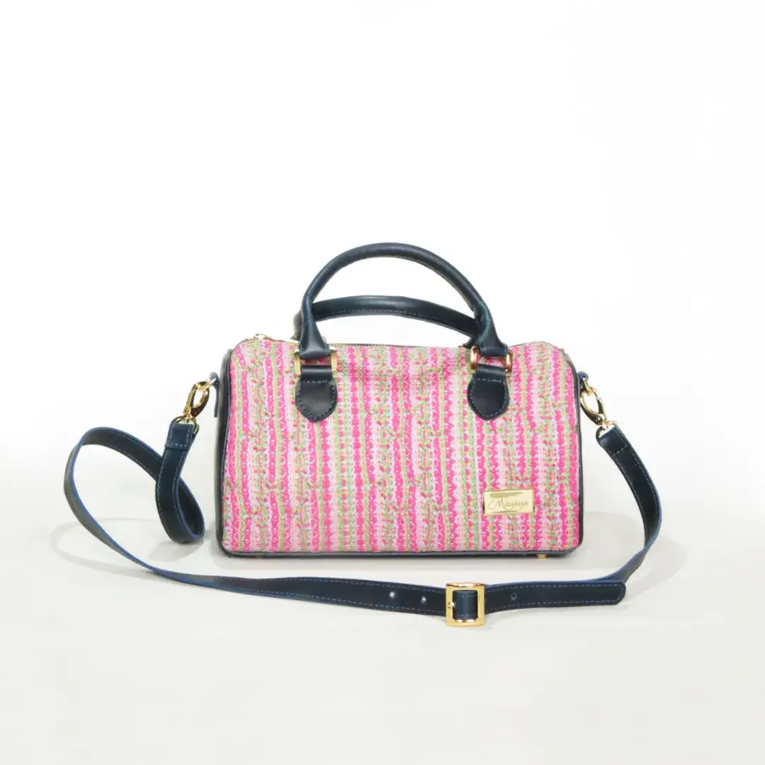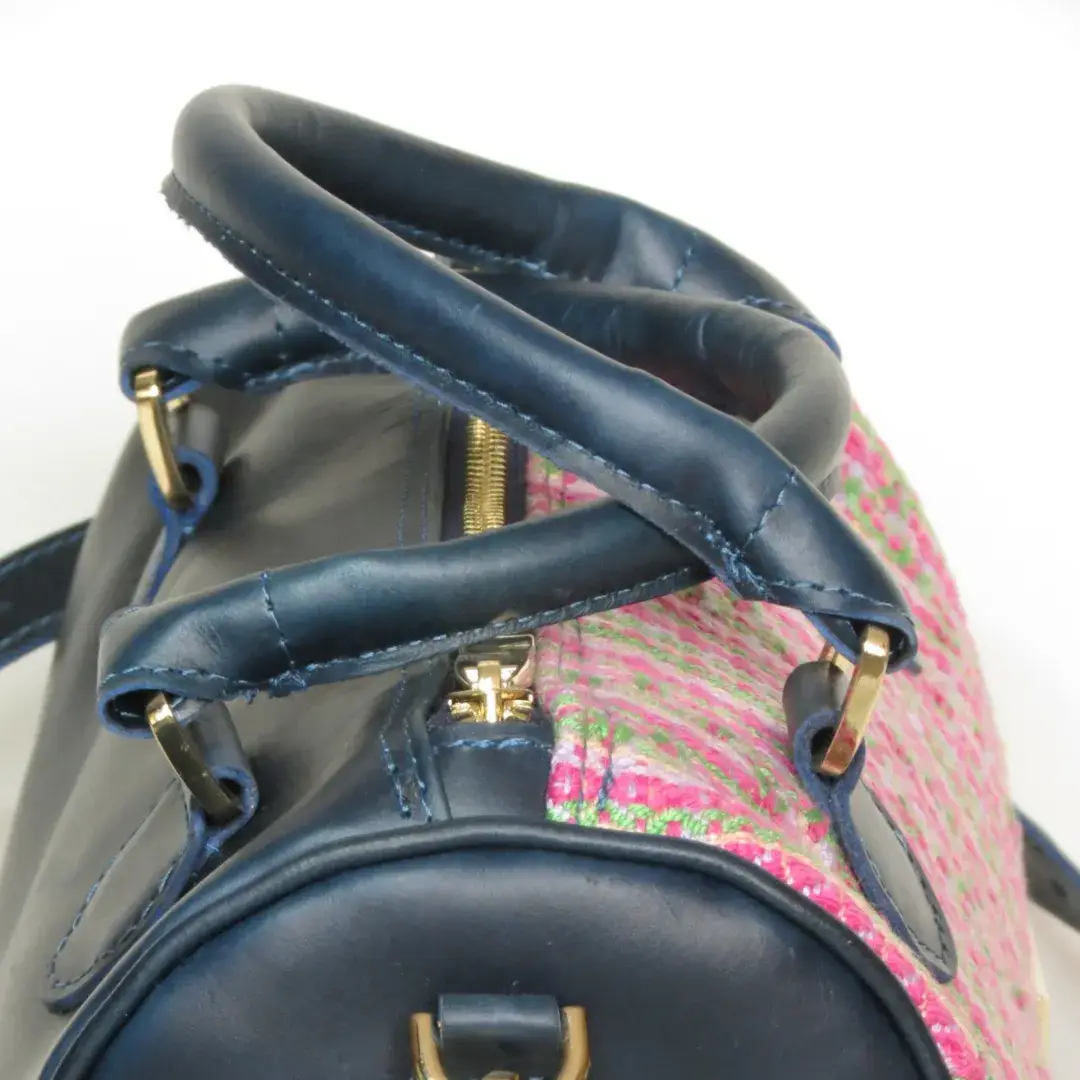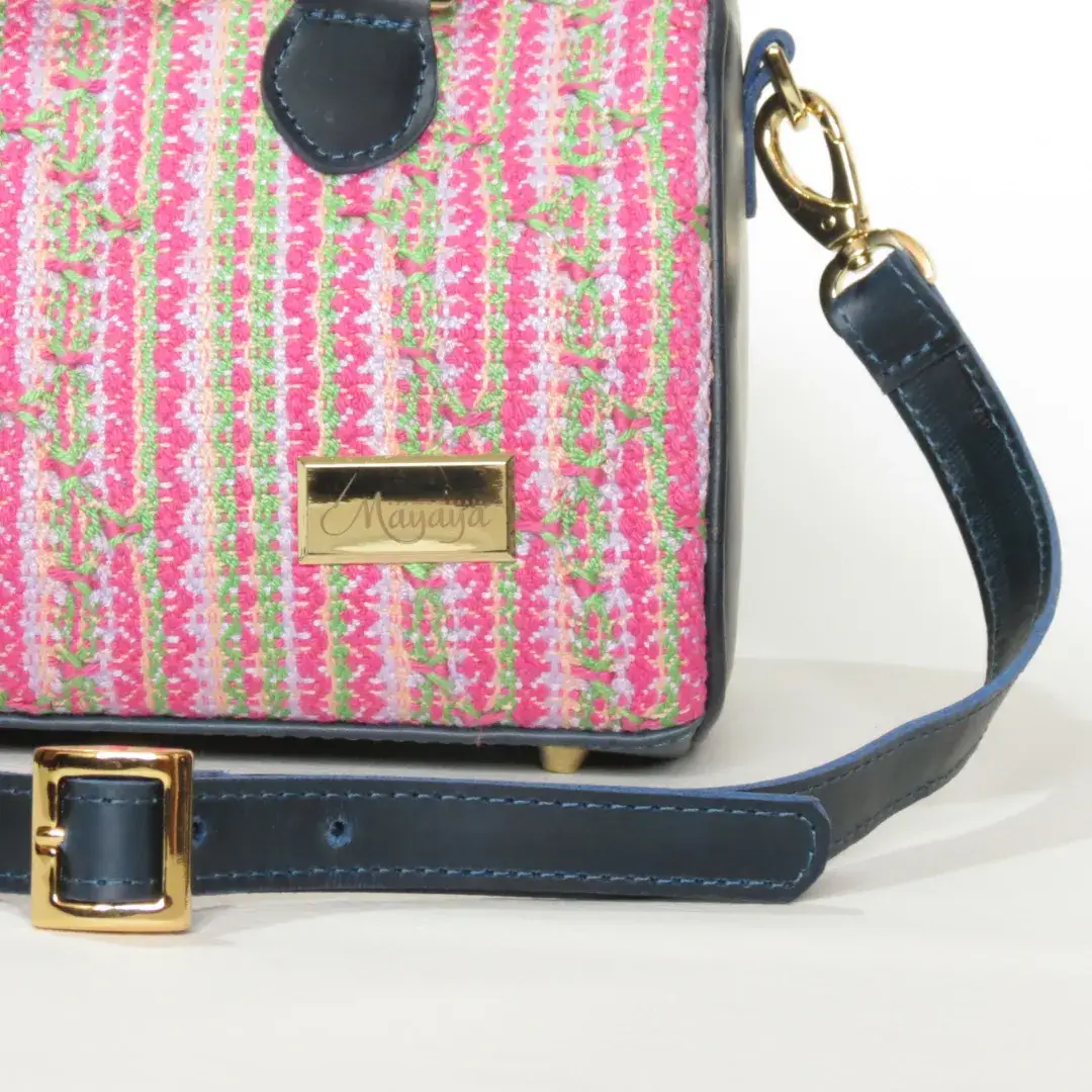 Baúl hecho en cuero semigraso traspasado color azul oscuro con tela de telar manual con una única y exclusiva combinación de hilos y colores rosa-verde-fucsia. Tiene manijas para llevar en la mano y cargador para llevarlos cruzado. Lleva deslizadores en la base.