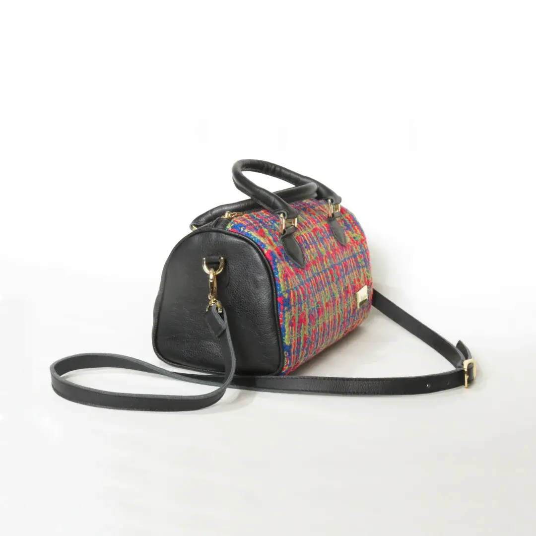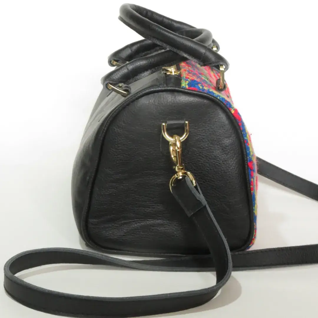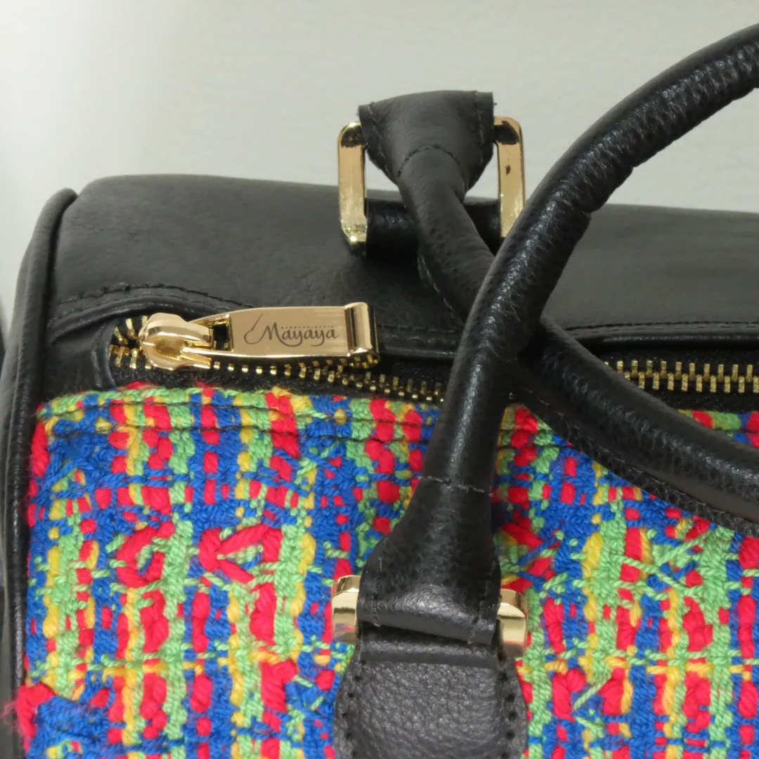 Baúl hecho en cuero semigraso traspasado color negro con tela de telar manual con una única y exclusiva combinación de hilos y colores rojo-azul-amarillo-verde. Tiene manijas para llevar en la mano y cargador para llevarlos cruzado. Lleva deslizadores en la base.