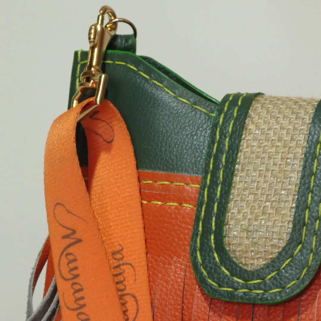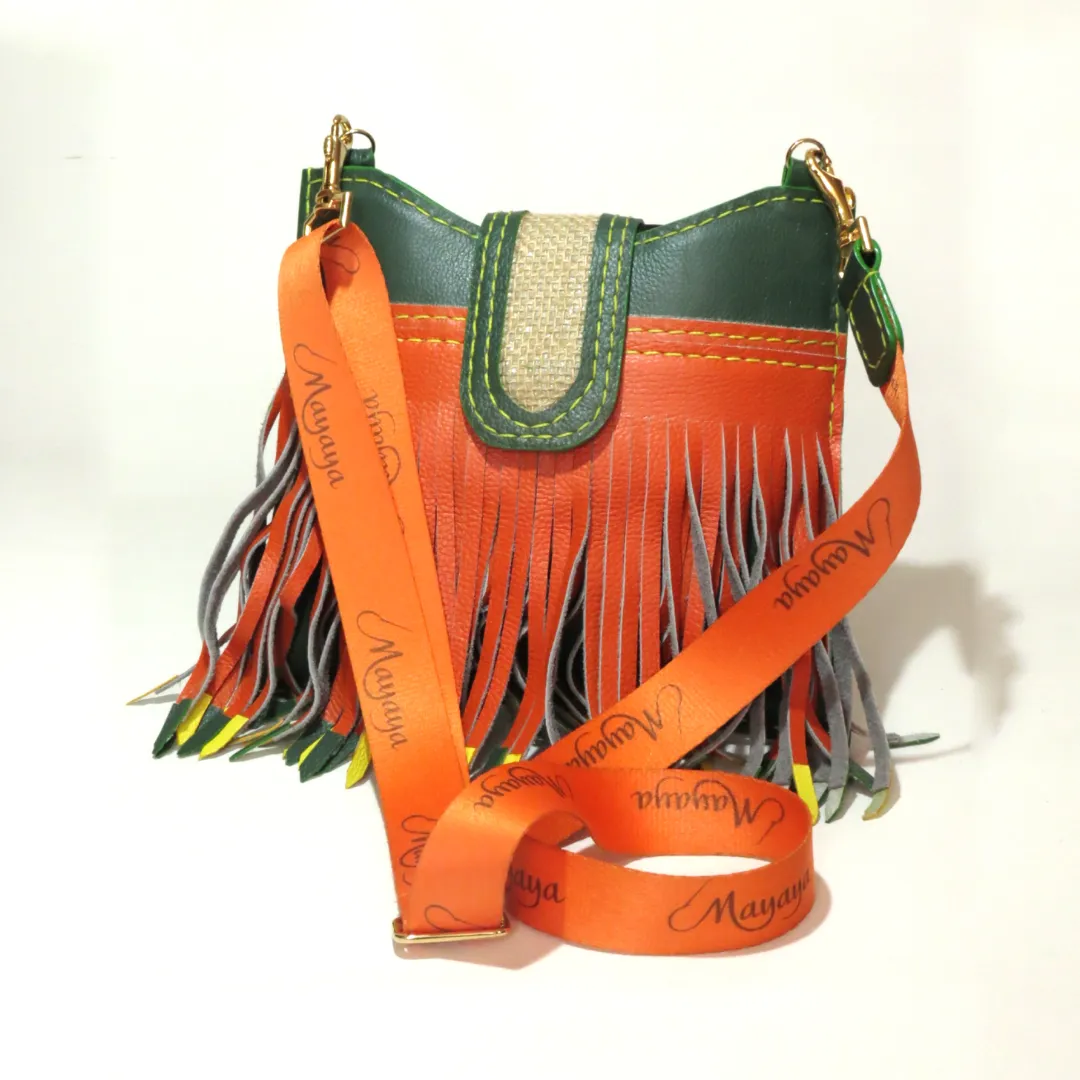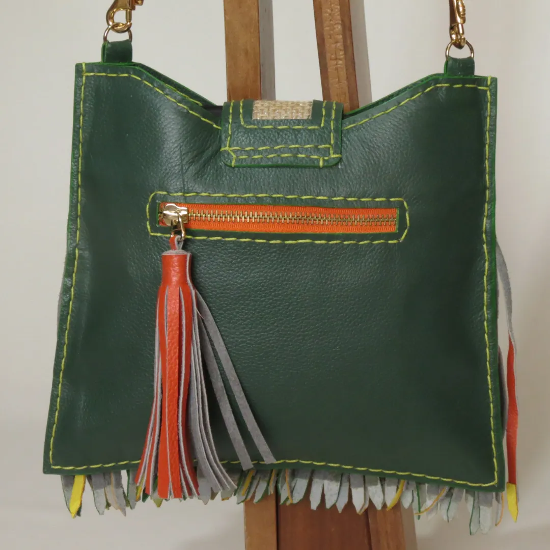 Material: Cuero, flecos multicolor y solapa en telar rústico.